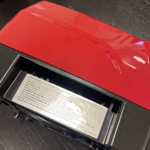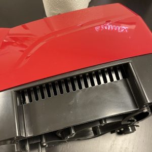 En ny maskin som tyvärr fått en transportskada. Trasigt galler på ena sidan på basen (se bild nedan, med och utan ”galler”). Inget som påverkar funktionen.